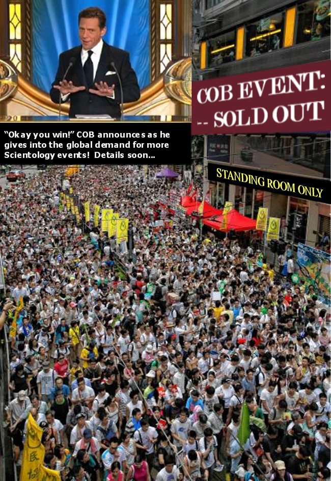 “The Church presently has 7-10 major events each year,” Delusion explained. “However, these events are sold out years in advance and are standing room only. Moreover, the Church has a duty to stage hundreds of extra events in order to prevent lethal stampedes as happened when 12,000 people were trampled to death during COB’s live appearance at the grand opening of the Flag Building.”