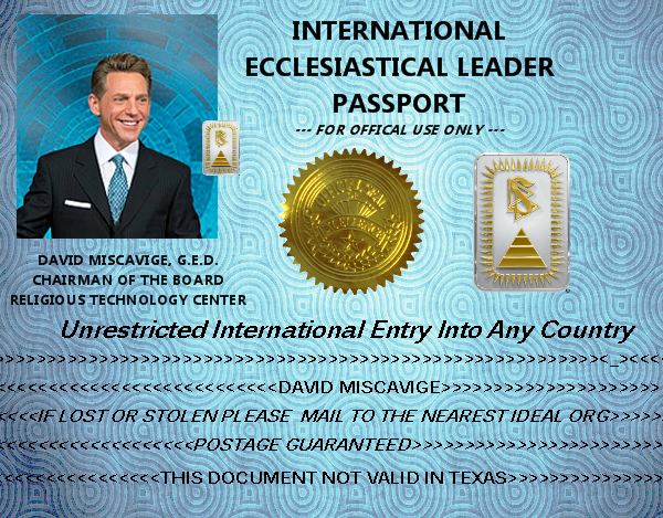 Whereupon it becomes evident that another document is necessary. Therefore, as proof of my identity and standing in the world community I am herewith and hereby vouchsafing to your care a copy of my International Ecclesiastical Leader Passport. This document features both an official gold seal and the Religious Technology Center (RTC) device thus proving and certifying its genuineness and fidelity as an ecclesiastically legal document.