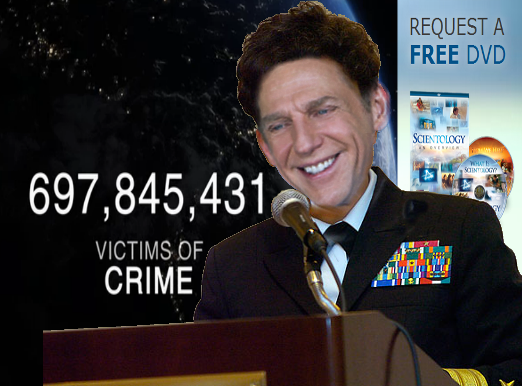 “If you have been the victim of a crime,” Captain Miscavige said, “this free Scientology DVD explains how, for as little as $800,000, Scientology can help you locate the hidden source of all human aberrations.”