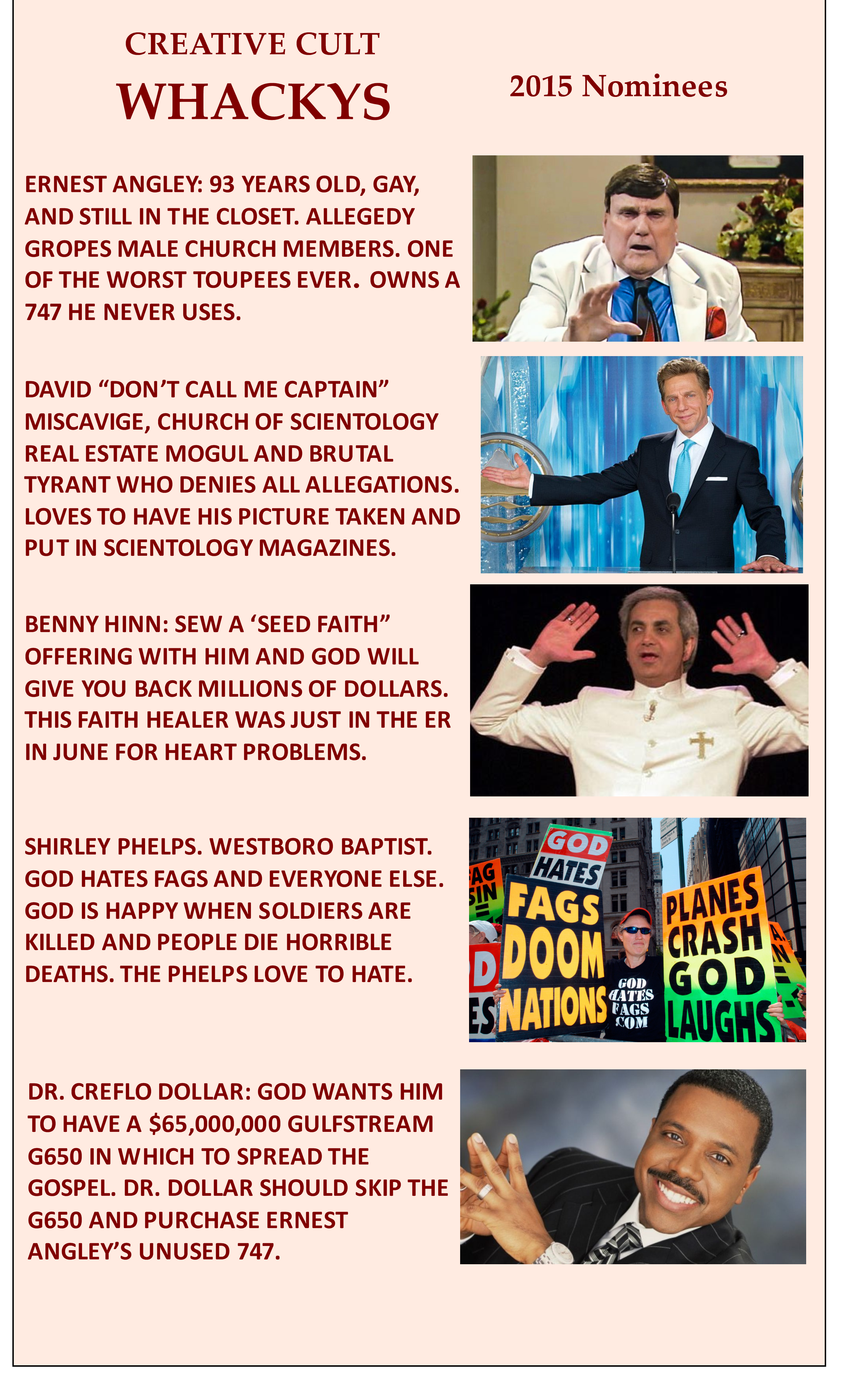 “Don’t call me Captain” is the odds on favorite to win yet another “Whacky” coming on the heels of the sweep by “Going Clear”. Miscaviage acknowledged that any publicity is good publicity. “I’ve got Sherman working on my acceptance speech right now”.