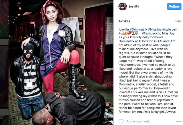 DP: Joy you’re not answering my question. I also need to remind our viewers about these dominatrix photos of you that are all over the internet. And then there’s Scientology. You’re very involved in Scientology and yet claim to be a Christian. Seems to me you’ll do anything to get attention and have never confronted your anger issues…