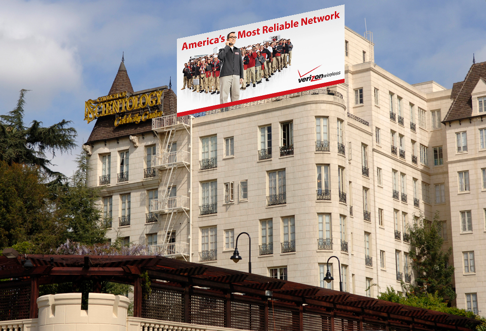 “Verizon snapped up the prime billboard on the Celebrity Centre,” said Church spokesman Ken Delusion.