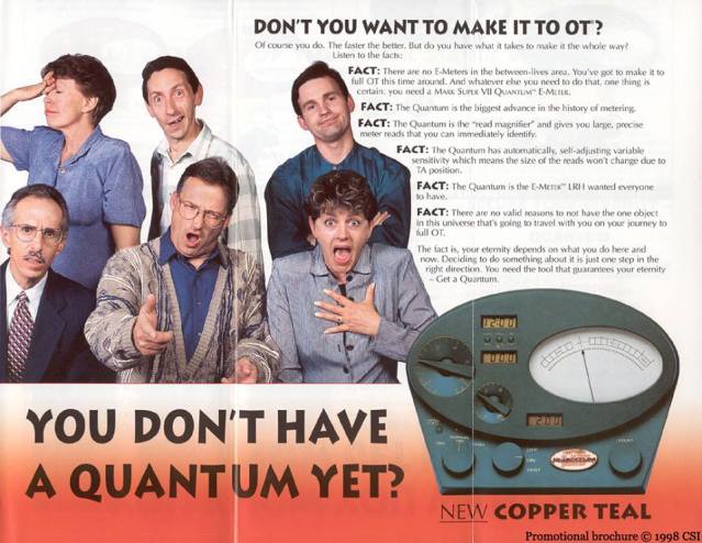 “Buy your Quantum E-Meter today at Flag. And you’ll need a spare e-meter in case one breaks while you’re in the middle of a heavily charged incident! OT’s are known to influence electronics and charge can fry a meter! Have a backup in place!”