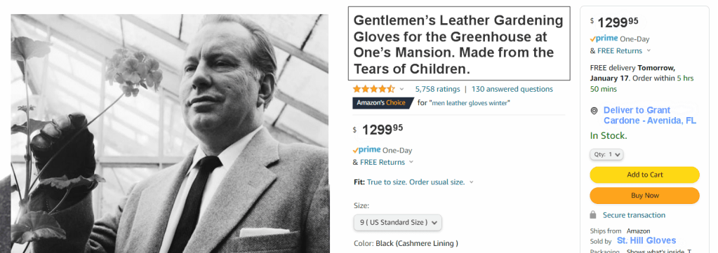 Made by Sea Org child slave labor! Quality guaranteed! If the gloves you buy are not satisfactory, COB promises to personally beat the slaves who made the gloves!