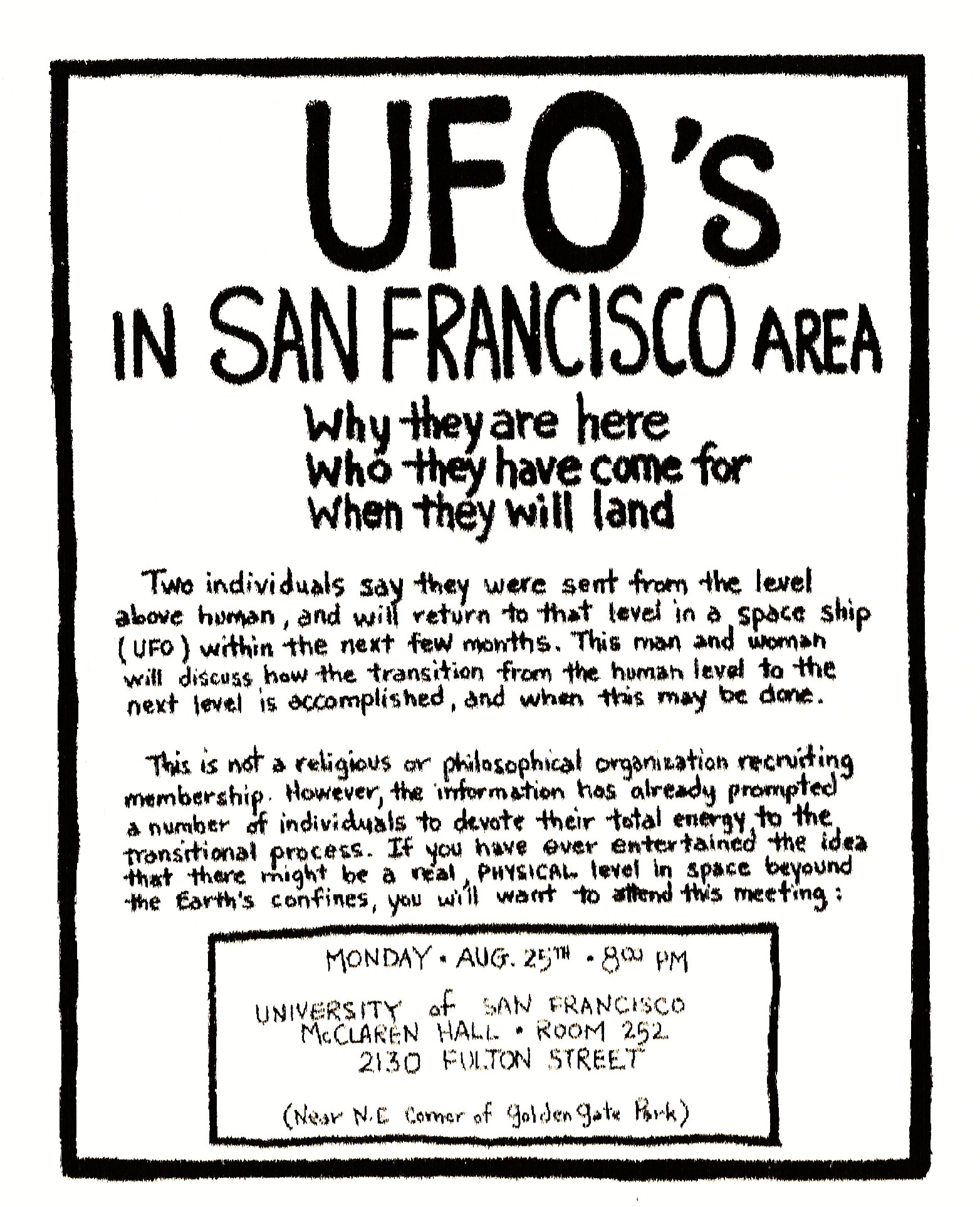 After completing the Purif, the Student Hat, and other courses the Heaven’s Gate Crew plans to join the Sea Org — which is a genuine Space Navy — and open the new Heaven’s Gate Org in Rancho Santa Fe, California.